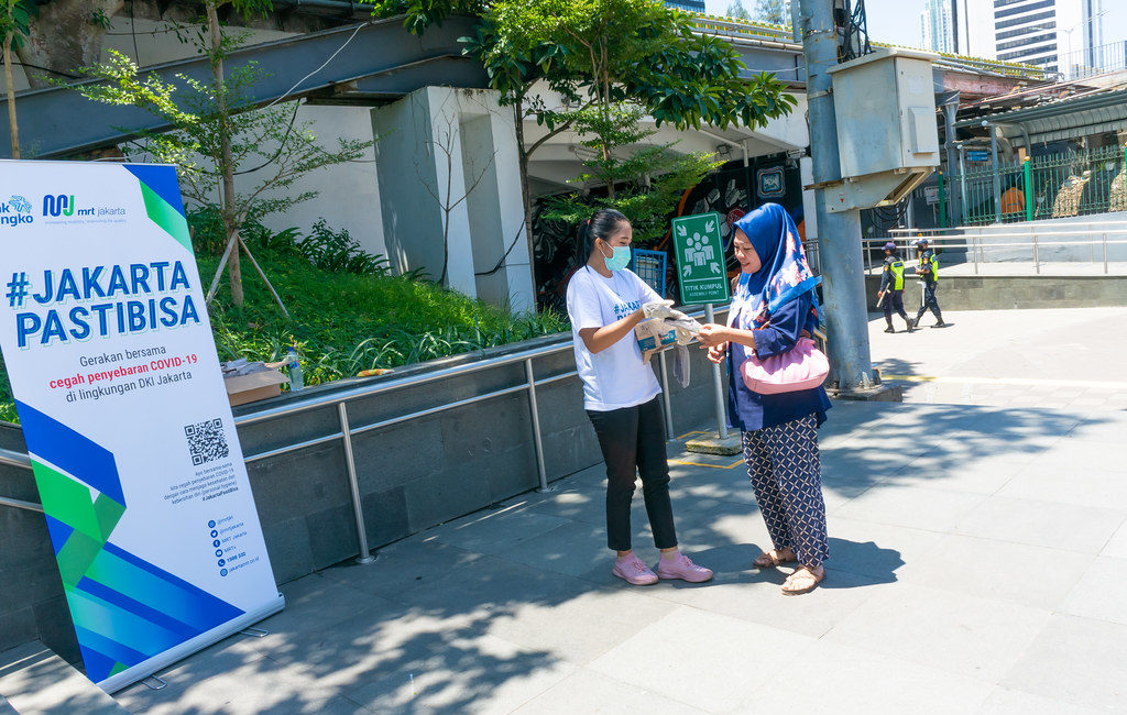 - Pembagian 3.000 lembar masker kain dua lapis yang dapat dicuci di lima stasiun besar MRT Jakarta (Lebak Bulus Grab, Fatmawati, Blok M BCA, Dukuh Atas BNI, dan Bundaran HI). Pembagian langsung ini dilakukan selama empat hari, yaitu 14—17 April 2020 dengan tetap memperhatikan aspek jaga jarak fisik antara satu sama lain.