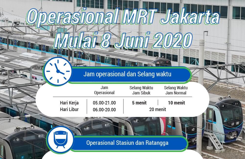Pemberlakukan Pembatasaan Sosial Berskala Besar (PSBB) Masa Transisi I yang sudah diterapkan sejak Jumat, 5 Juni 2020 lalu dan jelang dibukanya sektor perkantoran pada Senin, 8 Juni 2020 besok, PT MRT Jakarta (Perseroda) memberlakukan sejumlah penyesuaian seperti waktu operasional kereta dan stasiun pada hari kerja (weekdays) dimulai pada pukul 05.00 hingga 21.00 WIB dan pada akhir pekada (weekend) dimulai pada pukul 06.00 WIB hingga 20.00 WIB. Di hari kerja, kereta akan berangkat setiap lima menit pada waktu sibuk (07.00—09.00 WIB dan 17.00—19.00 WIB) dan setiap 10 menit di luar itu. Di akhir pekan, kereta akan berangkat setiap 20 menit. Selain itu, PT MRT Jakarta (Perseroda) juga meniadakan kereta khusus wanita yang biasanya diterapkan pada waktu sibuk di hari kerja.