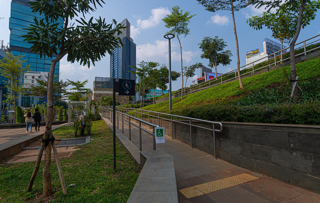 Direktur Operasi dan Pemeliharaan Muhammad Effendi melintas di rak sepeda Taman Dukuh Atas. Inspeksi dilakukan dengen bersepeda dari Stasiun Bundaran HI hingga Depo Lebak Bulus. Foto oleh PT MRT Jakarta (Perseroda)/Nasrullah