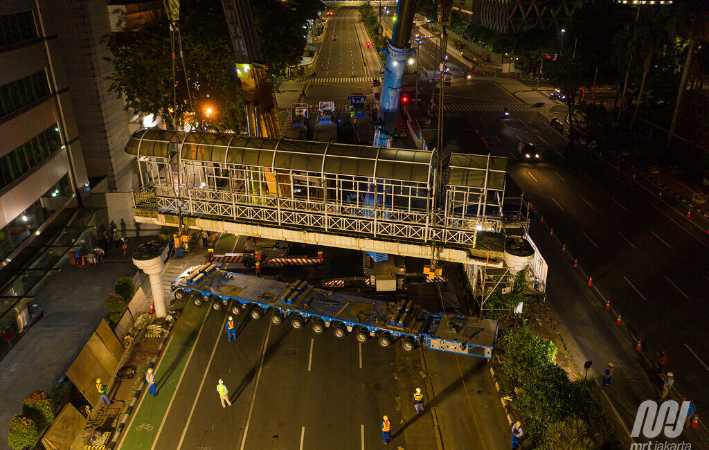 Gelagar JPO BI diangkat dan diletakkan di atas multi axle trailer. Foto oleh PT MRT Jakarta (Perseroda)/Irwan Citrajaya