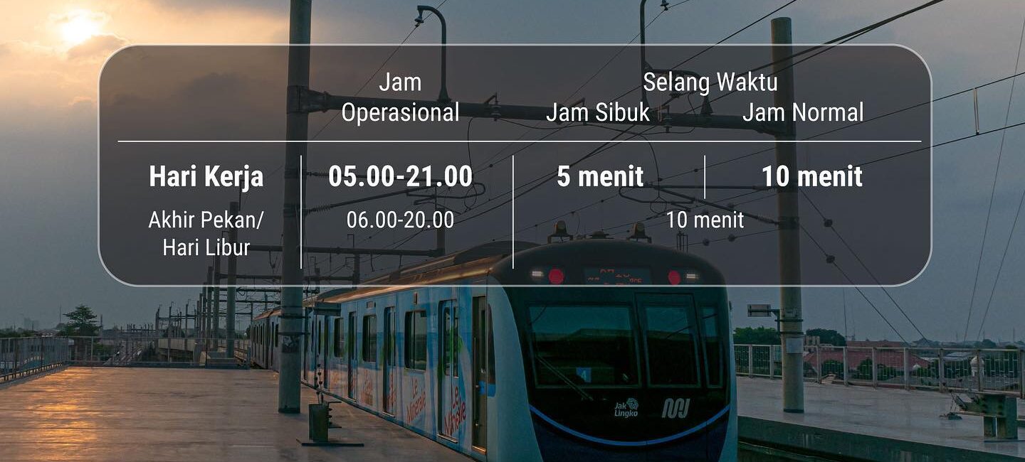 - pada Senin hingga Jumat, selang waktu keberangkatan antarkereta setiap lima menit pada waktu sibuk, yaitu pukul 07.00—09.00 WIB dan 17.00—19.00 WIB serta setiap 10 menit di luar waktu sibuk sedangkan pada akhir pekan menjadi setiap 10 menit.