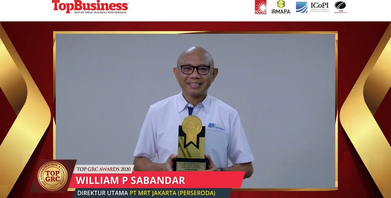 “Atas nama PT MRT Jakarta (Perseroda), saya mengucapkan terima kasih dan apresiasi setinggi-tingginya atas penghargaan yang dianugerahkan kepada kami. Bagi PT MRT Jakarta (Perseroda) implementasi Governance, Risk, and Compliance (GRC) merupakan hal yang mutlak diterapkan di setiap tingkatan MRT Jakarta,” ungkap William. “Mulai dari sistem, infrastruktur, manajemen risiko, hingga manajemen kepatuhan harus diimplementasikan dengan baik karena akan mendukung peningkatan kinerja bisnis yang berkelanjutan,” tambah ia. “Ini adalah bentuk penghargaan kepada seluruh insan PT MRT Jakarta (Perseroda) yang telah berkomitmen untuk melaksanakan governance, risk management, dan compliance yang baik di PT MRT Jakarta (Perseroda),” pungkas ia. William juga menyampaikan bahwa GRC adalah fondasi atas kesuksesan bisnis MRT Jakarta dan dengan GRC yang baik maka MRT Jakarta akan terus sukses dan berhasil menjalankan bisnisnya menerobos krisis ini dan menjadi yang terdepan.