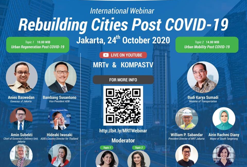 PT MRT Jakarta (Perseroda) bekerja sama dengan Pemerintah Provinsi DKI Jakarta, Kementerian Perhubungan RI, dan Asian Development Bank (ADB) akan menyelenggarakan webinar internasional pada Sabtu, 24 Oktober 2020 mendatang dengan topik utama Rebuilding Cities Post COVID-19. Webinar ini akan mendiskusikan dua topik yang terbagi menjadi dua sesi, yaitu Urban Regeneration Post COVID-19 pada sesi pertama dengan pembicara Gubernur Provinsi DKI Jakarta Anies Baswedan, Wakil Presiden ADB Bambang Susantono, Ketua TGUPP Provinsi DKI Jakarta Amin Subekti, Direktur ADB Thailand Hideaki Iwasaki, Direktur ADB for Filipina Kelly Bird, dan Monash Art Design Architecture Australia Dasha Spasojevic.
