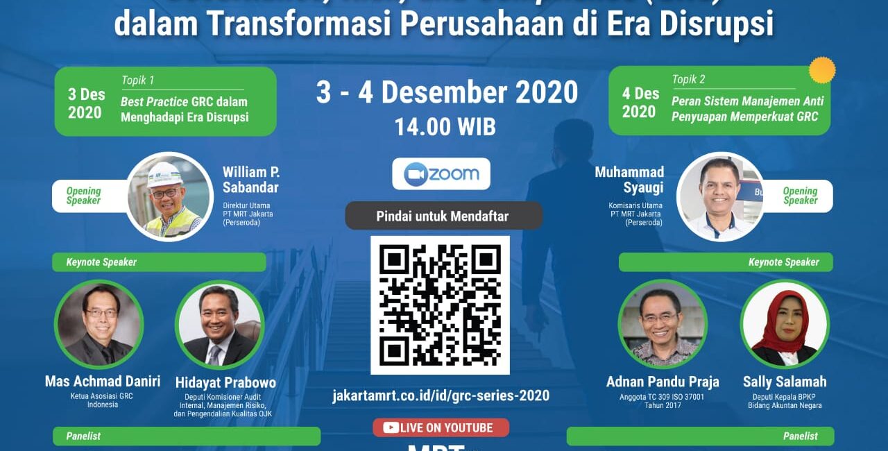 Dalam sesi webinar GRC Series 2020 yang berlangsung selama dua hari pada Kamis dan Jumat (3—4-12-2020) lalu, PT MRT Jakarta (Perseroda) menghadirkan diskusi yang membahas tantangan dan peluang penerapanan governance, risk, and compliance (GRC) dalam transformasi perusahaan pada era disrupsi seperti saat ini. Diskusi menghadirkan pembicara yang mendorong penerapan GRC demi keberlanjutan korporasi.