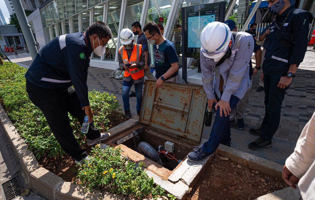 Bahkan, lanjut Effendi, tim MRT Jakarta telah membuat beberapa saluran water trap atau drainase untuk mengalirkan limpasan air dari gedung atau jalan raya ke drainase kota. “Kami juga menggunakan pompa air khusus jenis submersible pump yang kami pasang di dalam stasiun dan di area entrance khususnya di Stasiun Setiabudi Astra dan Istora Mandiri karena beberapa letak pintu masuknya yang lebih rendah dari jalan,” jelas ia sembari menunjukkan pompa yang dimaksud. Pompa ini akan mengalirkan air genangan di sekitar entrance ke drainase kota. Lebih jauh lagi, di area pedestrian Stasiun Setiabudi Astra dengan potensi genangan, telah disiapkan tujuh titik sumur resapan.