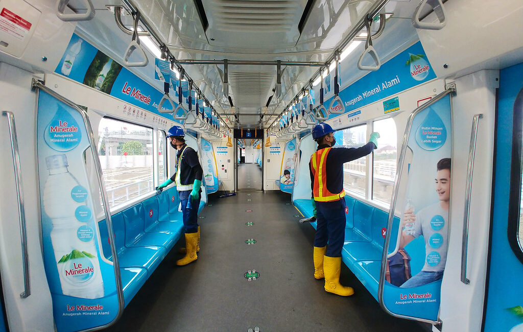 Petugas kebersihan dengan membersihkan jendela bagian dalam ratangga. Foto oleh PT MRT Jakarta (Perseroda)/Irwan Citrajaya.