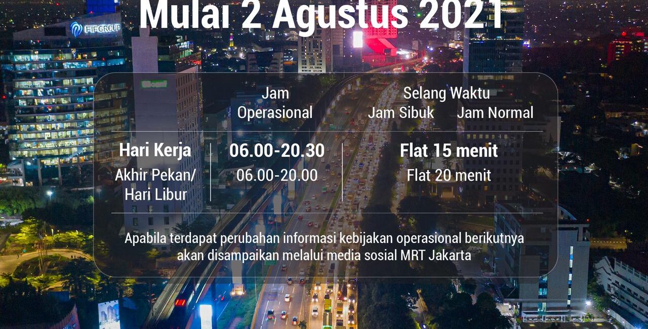 Terhitung sejak Senin (2-8-2021) mendatang, PT MRT Jakarta (Perseroda) mulai memberlakukan jadwal operasi pukul 06.00—20.30 WIB setiap hari berlaku Senin—Jumat dengan selang waktu keberangkatan kereta setiap 15 menit dan pukul 6.30—20.00 WIB pada akhir pekan dengan selang waktu keberangkatan antarkereta setiap 20 menit. PT MRT Jakarta (Perseroda) juga membatasi kapasitas keterangkutan per kereta (cars) 65 orang per kereta (gerbong/cars). Penyesuaian jadwal operasi ini merupakan tindak lanjut dari Keputusan Gubernur DKI Jakarta Nomor 875 Tahun 2021 Tentang Pemberlakukan Pembatasan Kegiatan Masyarakat Darurat Corona Virus Disease 2019 dan Keputusan Kepala Dinas Perhubungan Provinsi DKI Jakarta Nomor 259 Tahun 2021 tentang Pemberlakukan Petunjuk Teknis Pembatasan Kapasitas Angkut dan Waktu Operasional Sarana Transportasi Dalam Rangka Pemberlakuan Pembatasan Kegiatan Masyarakat Darurat COVID-19.
