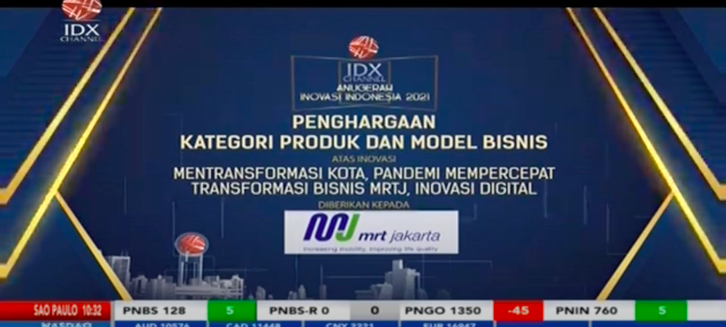 Sebagai perusahaan layanan publik, PT MRT Jakarta (Perseroda) senantiasa berinovasi agar masyarakat mendapatkan pelayanan terbaik. Oleh karena itu, dalam ajang penghargaan IDX Channel Anugerah Inovasi Indonesia 2021lalu, PT MRT Jakarta (Perseroda) mendapatkan penghargaan dalam kategori produk dan model bisnis atas inovasi “Mentransformasi kota, Pandemi Mempercepat Transformasi Bisnis MRTJ, Inovasi Digital”. Penghargaan diberikan secara virtual dalam gelaran yang berlangsung pada Kamis (19-8-2021) lalu. ICAII 2021 merupakan ajang penghargaan yang mendukung dan memberikan apresiasi kepada innovator bisnis yang unggul dan menginspirasi.