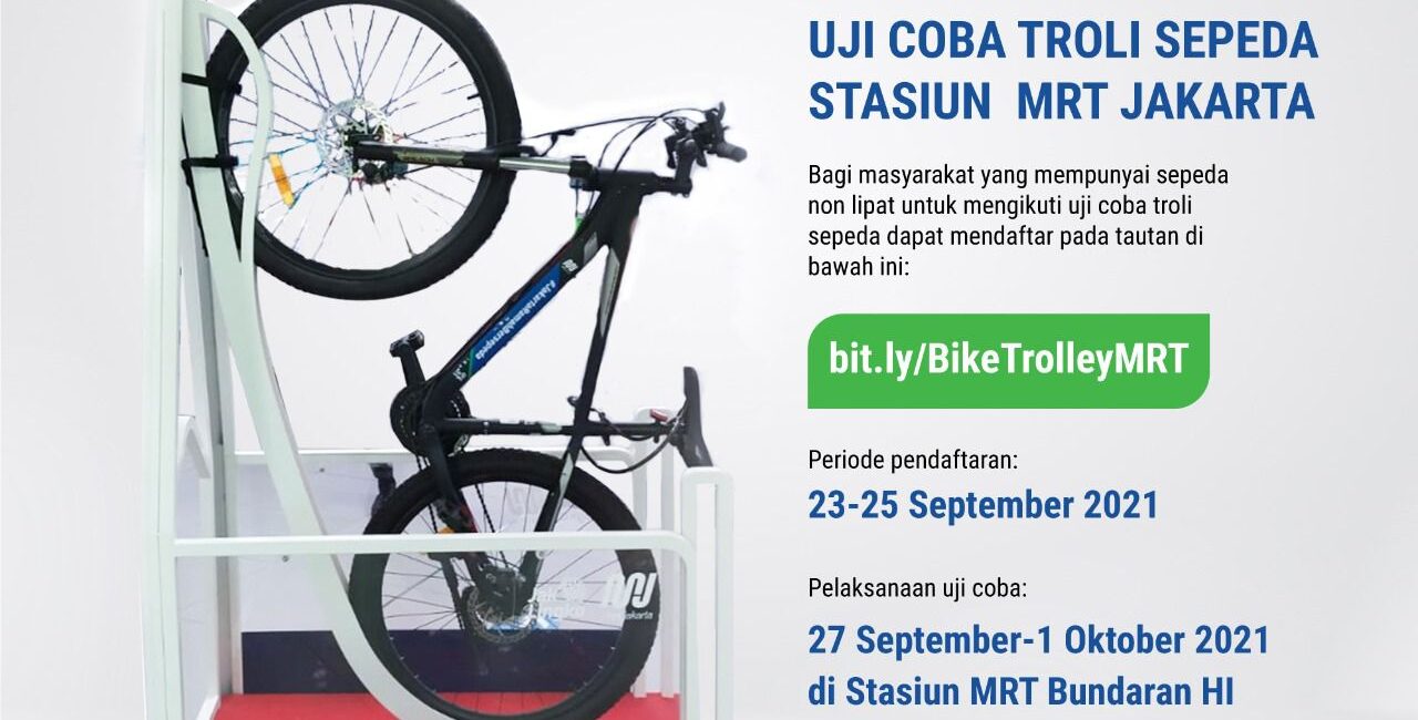 PT MRT Jakarta (Perseroda) akan melakukan uji coba troli sepeda nonlipat pada 27 September—1 Oktober 2021 di Stasiun Bundaran HI. Selama uji coba, akan disediakan dua unit troli sepeda nonlipat bagi peserta yang telah mendaftar sebelumnya. Pesepeda yang ingin ikut dalam uji coba ini dapat mendaftar melalui tautan bit.ly/BikeTrolleyMRT selama periode 23—25 September 2021.