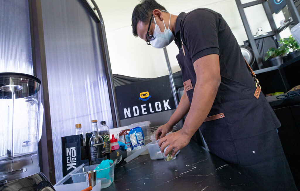 Damaz (25) terlihat fokus mengukur takaran bahan minuman khas gerainya. Ia sedang menyiapkan pesanan minuman Es Klepon yang diklaim sebagai salah satu menu favorit dan sering dipesan. Tak lama, ia menyerahkan pesanannya sembari menyampaikan “terima kasih” melalui bahasa isyarat. Damaz adalah tuli sejak lahir. Per 1 September 2021 lalu, ia dan salah satu rekannya membuka gerai minuman es di Stasiun Fatmawati yang ia beri nama Ndelok. Meskipun awalnya ragu dengan penjualan, ia mengklaim saat ramai, berbagai macam es racikannya bisa terjual hingga 50 gelas per hari.