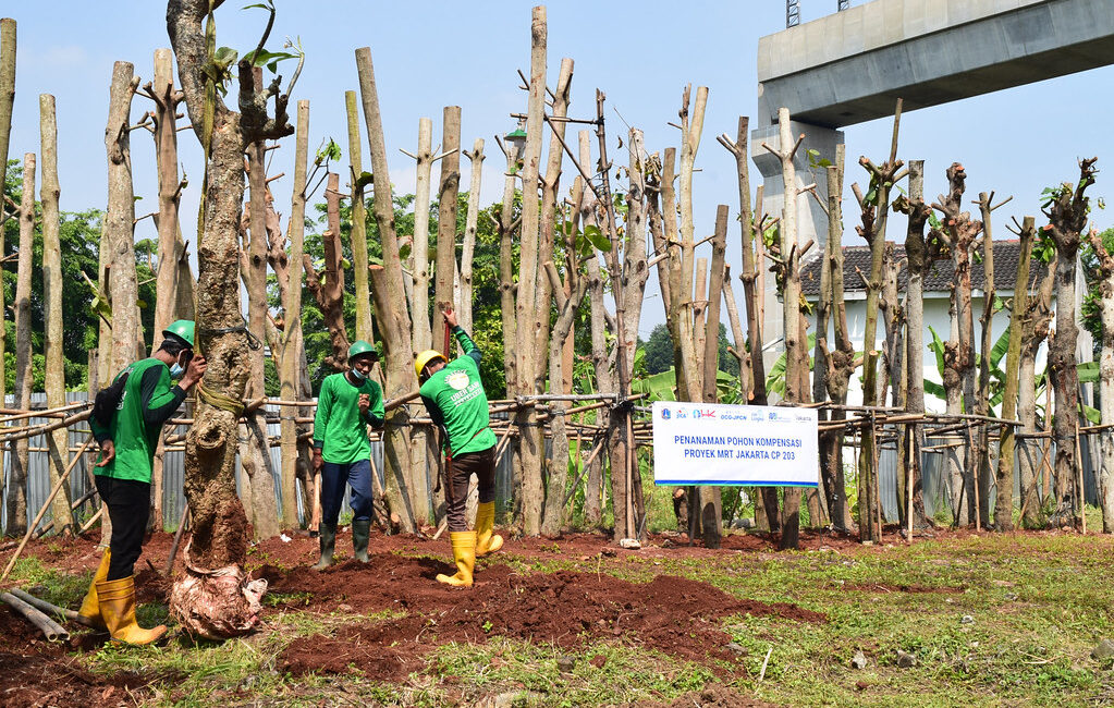 Pekerja menanam pohon sebagai kompensasi pembangunan CP 203. Foto oleh PT MRT Jakarta (Perseroda)/Nasrullah.