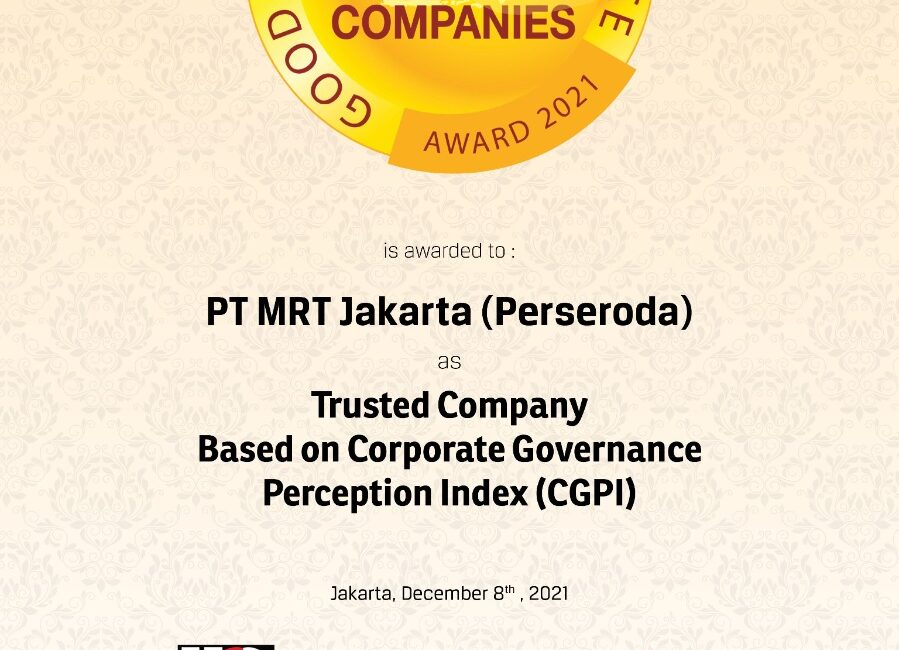 PT MRT Jakarta (Perseroda) berhasil memperoleh penghargaan dalam program Corporate Governance Perception Index (CGPI) 2020 kategori Trusted Company. Penghargaan tersebut merupakan bentuk apresiasi terhadap upaya dan inisiatif PT MRT Jakarta (Perseroda) dalam membangun ketahanan perusahaan berdasarkan prinsip tata kelola perusahaan yang baik dalam rangka menciptakan nilai bagi para pemangku kepentingan guna mewujudkan pertumbuhan perusahaan yang berkelanjutan secara etika dan bermartabat. Penghargaan diumumkan pada Rabu (8-12-2021) di Hotel Shangri-La, Jakarta.