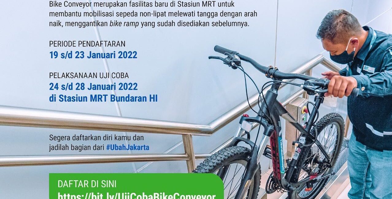 Sebagai bentuk dukungan terhadap pesepeda yang menggunakan transportasi publik, MRT Jakarta menyediakan fasilitas sabuk berjalan (conveyor belt) khusus sepeda. Penggunaannya ditujukan sebagai salah satu fitur pilihan untuk keluar dari area stasiun. Dalam proses penyediaannya di stasiun, MRT Jakarta membuka kesempatan untuk ikut dalam uji coba bike conveyor tersebut pada 24—28 Januari 2022. Pesepeda yang ingin ikut dapat mendaftar melalui tautan: https://bit/ly/UjiCobaBikeConveyor  selama periode 19–23 Januari 2022. Untuk saat ini, fitur ini tersedia di Stasiun Bundaran HI.