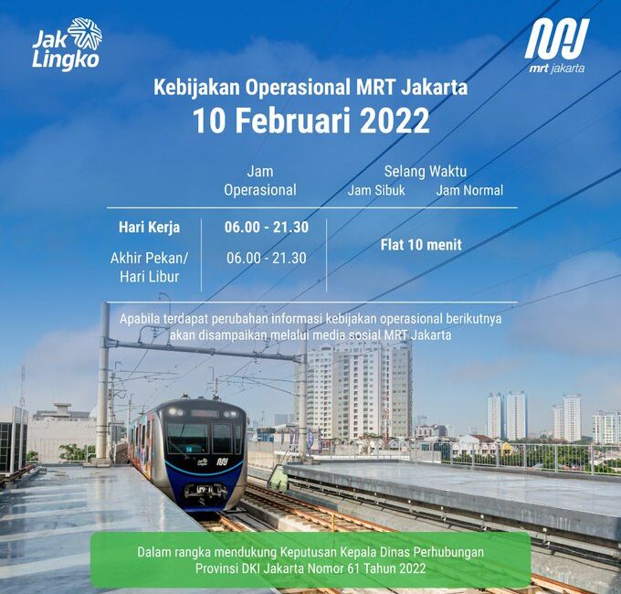 PT MRT Jakarta (Perseroda) memberlakukan jadwal operasi pukul 06.00—21.30 WIB setiap hari berlaku Senin–Minggu dengan selang waktu keberangkatan kereta setiap 10. Perubahan jadwal tersebut mulai berlaku pada Kamis (10-2-2022). PT MRT Jakarta (Perseroda) juga membatasi kapasitas keterangkutan per kereta (cars) 65 orang per kereta (gerbong/cars). Penyesuaian jadwal operasi ini merupakan tindak lanjut dari Pemberlakuan Pembatasan Kegiatan Masyarakat (PPKM) Level 3 di DKI Jakarta yang ditetapkan pemerintah dalam Keputusan Kepala Dinas Perhubungan Provinsi DKI Jakarta Nomor 61 Tahun 2022.