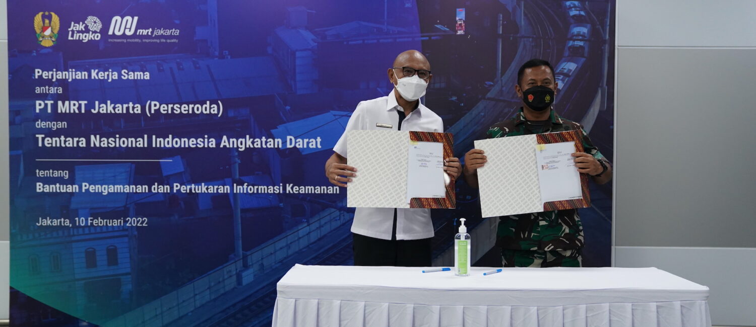 PT MRT Jakarta (Perseroda) dan Tentara Nasional Indonesia Angkatan Darat menandatangani Perjanjian Kerja Sama tentang Bantuan Pengamanan dan Pertukaran Informasi Keamanan.Penandatanganan dilakukan langsung oleh Direktur Utama PT MRT Jakarta (Perseroda) William Sabandar dan Pangdam Jaya/Jayakarta Mayor Jenderal TNI Untung Budiharto di Stasiun Bundaran HI, Jakarta Pusat, pada Kamis (10-2-2022). Perjanjian kerja sama tersebut meliputi bantuan pengamanan dan pertukaran informasi keamanan. Rencananya, kerja sama ini akan berlangsung selama tiga tahun ke depan.