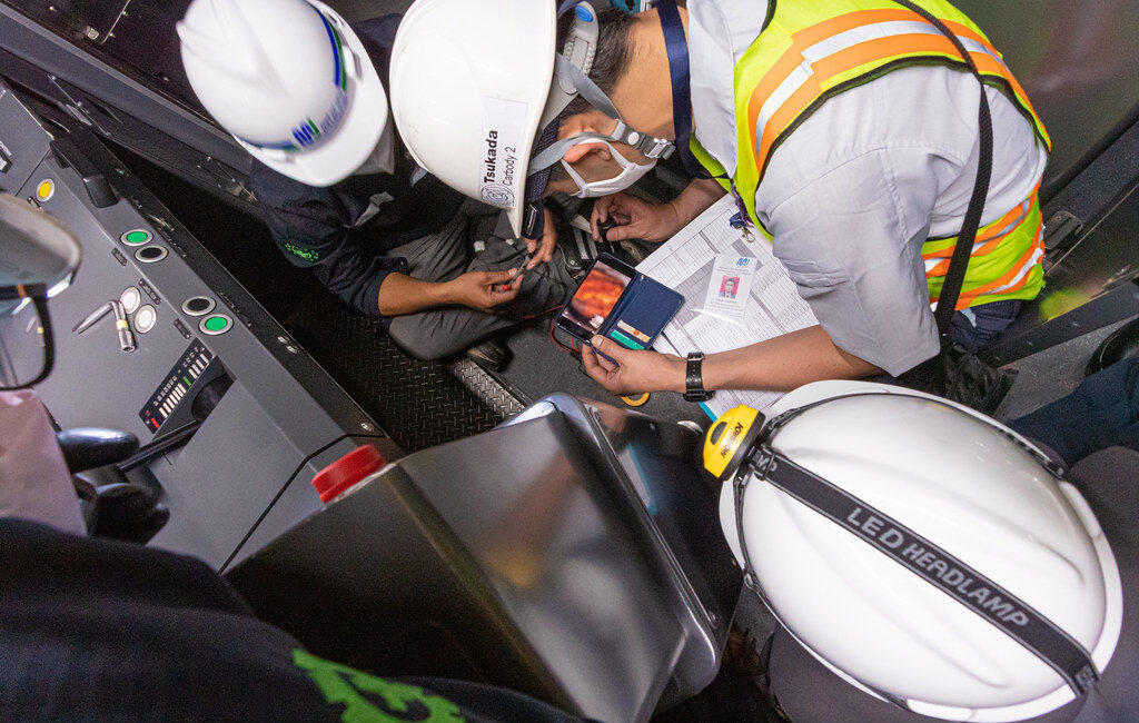 Tenaga ahli dari JR East Jepang sedang melakukan demonstrasi salah satu onderdil sistem pengereman ratangga. Foto oleh PT MRT Jakarta (Perseroda)/Irwan Citrajaya.