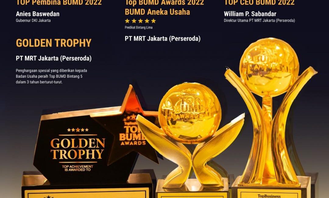 Dalam ajang TOP BUMD Award 2022, PT MRT Jakarta (Perseroda) menerima empat penghargaan dengan kategori TOP BUMD Awards 2022 BUMD Aneka Usaha dengan predikat bintang 5, TOP CEO BUMD 2022 untuk Direktur Utama PT MRT Jakarta (Perseroda) William Sabandar, Golden Trophy atas capaian sebagai TOP BUMD predikat bintang 5 selama tiga tahun berturut-turut, dan penghargaan khusus TOP Pembina BUMD 2022 untuk Gubernur DKI Jakarta, Anies Baswedan. Penghargaan tersebut diterima pada gelaran yang dilaksanakan di Jakarta pada Rabu (20-4-2022).