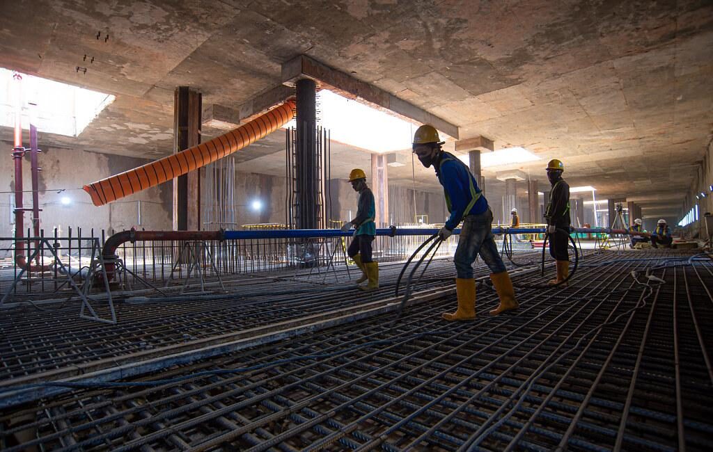 Para pekerja sedang menyiapkan lokasi pengecoran area beranda peron Stasiun Monas. Foto oleh PT MRT Jakarta (Perseroda)/Irwan Citrajaya.