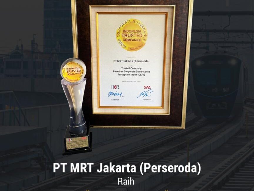 PT MRT Jakarta (Perseroda) meraih penghargaan “Trusted Company” atau perusahaan terpercaya dengan skor 83,60 dalam ajang Corporate Governance Perception Index (CGPI) yang berlangsung di Hotel Shangri-La, Jakarta, pada Selasa (20-12-2022). Penghargaan diterima langsung oleh Kepala Departemen Governance Corporate Affair PT MRT Jakarta (Perseroda) Prima Margaretha.