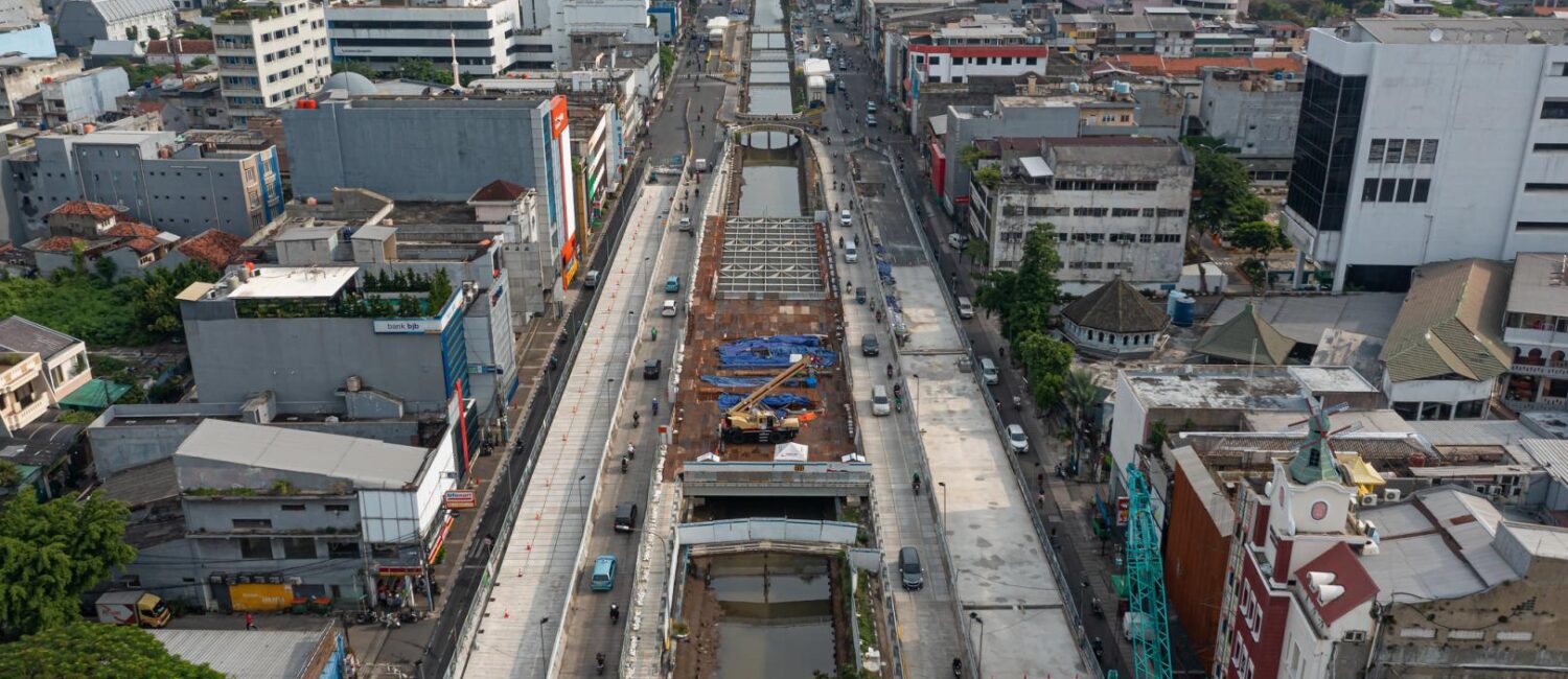 Pemangunan canal decking sebagai bagian dari rekayasa lalu lintas di Jalan Hayam Wuruk dan Gajah Mada. Foto oleh PT MRT Jakarta (Perseroda)/Irwan Citrajaya. 28-4-2023.