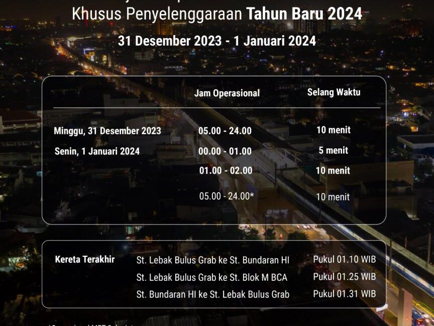 Perubahan pola operasi tersebut sebagai bentuk tindak lanjut Surat Keputusan Kepala Dinas Perhubungan Provinsi DKI Jakarta Nomor e-0180 Tahun 2023 tentang Penugasan Kepada PT MRT Jakarta dan PT LRT Jakarta untuk Penyediaan Layanan Perkeretaapian Pendukung Malam Muda Mudi Jakarta Kota Global Tahun Baru 2024.