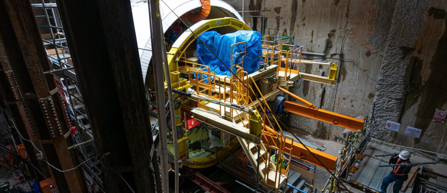 Pekerja sedang menyiapkan mesin bor terowongan di Stasiun Glodok sebelum mulai membangun terowongan menuju Stasiun Kota. Foto oleh PT MRT Jakarta (Perseroda)/Irwan Citrajaya.