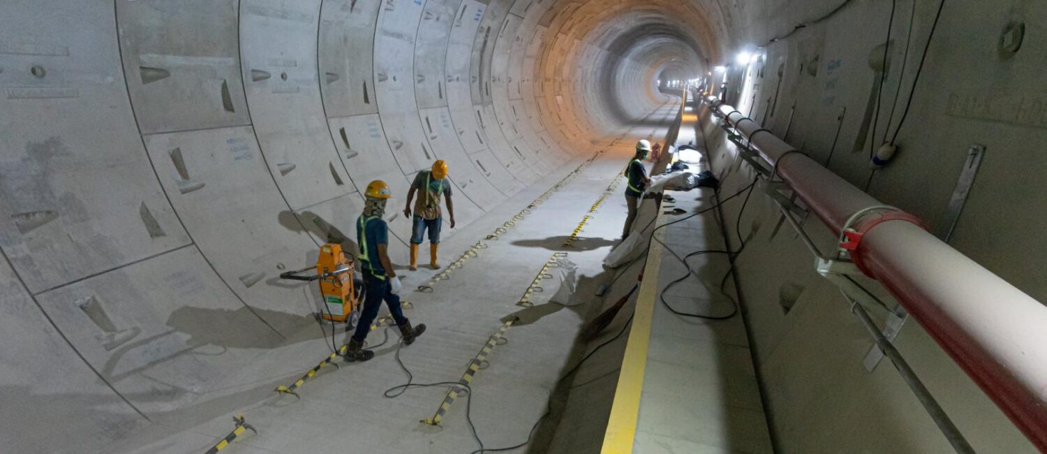 Pekerja sedang berada di terowongan penghubung Stasiun Thamrin dan Monas. Foto oleh PT MRT Jakarta (Perseroda)/Irwan Citrajaya.