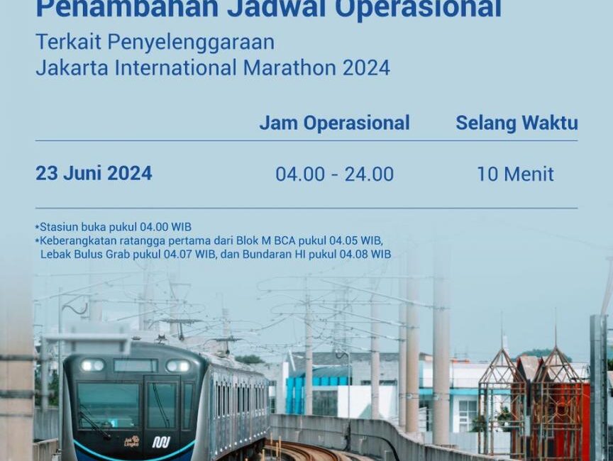 Mendukung pelaksanaan Jakarta International Marathon 2024 yang berlangsung pada Minggu (23-6-2024), PT MRT Jakarta (Perseroda) akan memberlakukan jadwal operasional khusus MRT Jakarta, yaitu pukul 04.00—24.00 WIB. Seluruh stasiun akan dibuka pada pukul 04.00 WIB. Keberangkatan ratangga pertama dari Stasiun Blok M BCA menuju Stasiun Bundaran HI pada pukul 04.05 WIB, Lebak Bulus Grab pada pukul 04.07 WIB, dan Bundaran HI pada pukul 04.08 WIB. Selang waktu keberangkatan antarkereta setiap 10 menit.