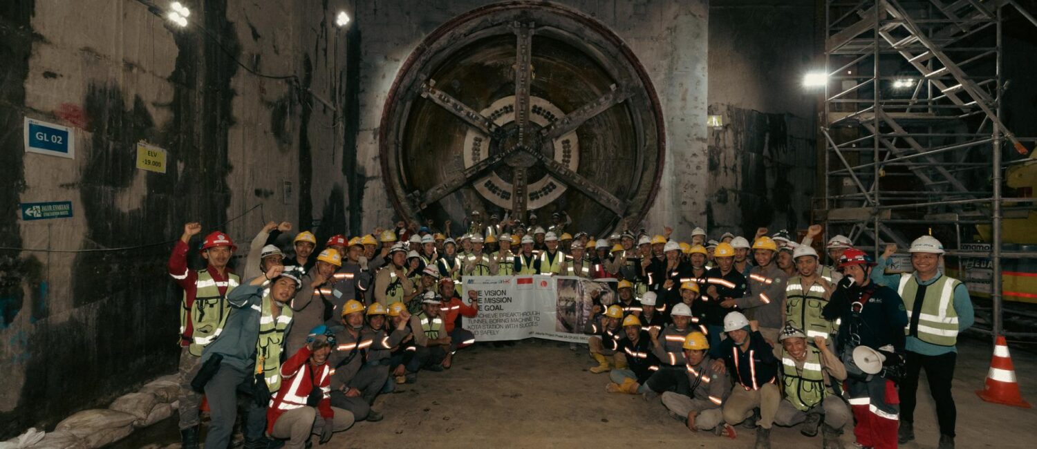 Wajah sumringah tim konstruksi di depan mata bor TBM 1. Foto oleh PT MRT Jakarta (Perseroda).