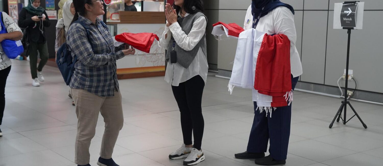 Petugas stasiun membagikan bendera RI saat momentum peringatan HUT ke-79 Republik Indonesia. Foto oleh PT MRT Jakarta (Perseroda).